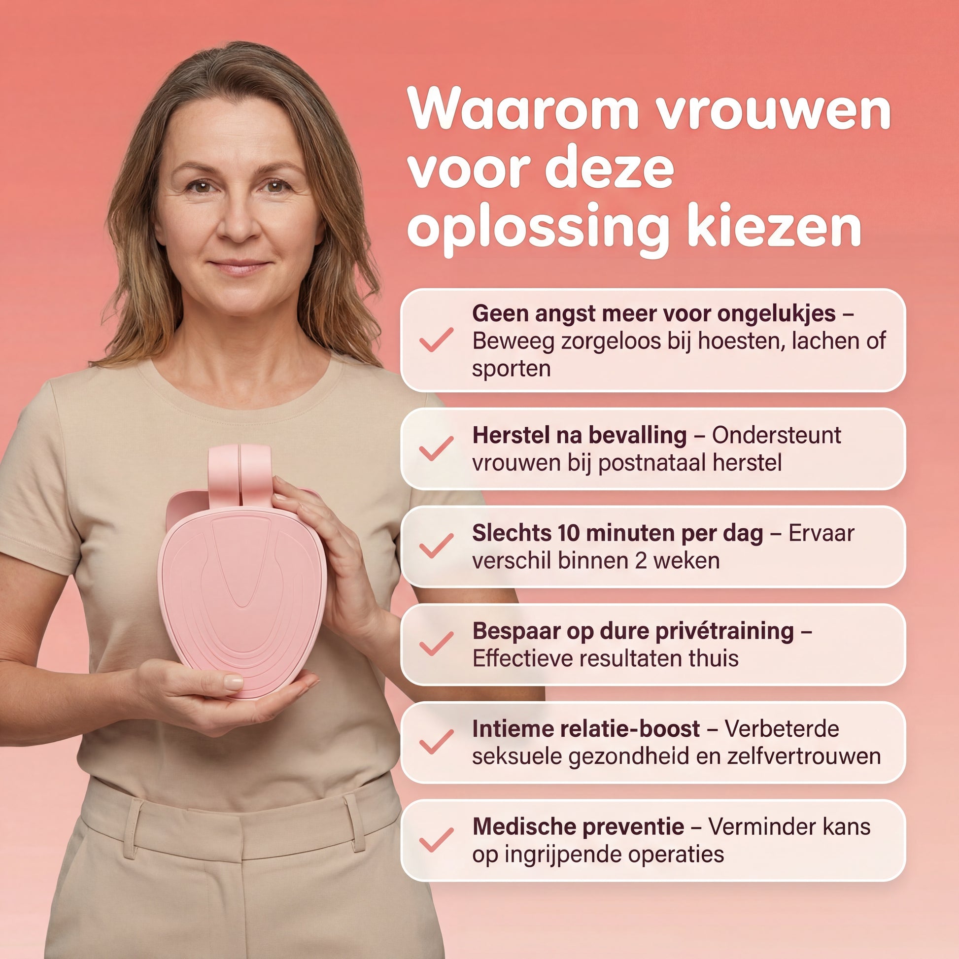 Helpt je bekkenbodem en dijspieren gericht te activeren. Minder spanning bij hoesten, lachen of sporten. Comfortabel, stil en gemaakt van lichaamsvriendelijke materialen.